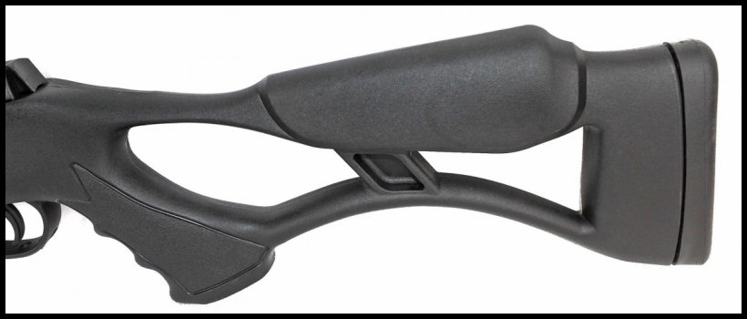 Ľahká zalamovacia vzduchovka s plastovou pažbou, poistkou a nastaviteľnou spúšťou.